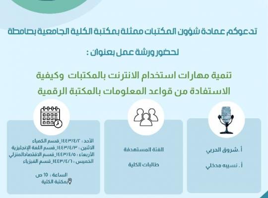 ورشة عمل بعنوان"تنمية مهارات استخدام الإنترنت بالمكتبات وكيفية الاستفادة من قواعد المعلومات بالمكتبة الرقمية"