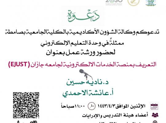 ورشة عمل بعنوان "التعريف بمنصة الخدمات الإلكترونية لجامعة جازان(EJUST)" في الكلية الجامعية بمحافظة صامطة