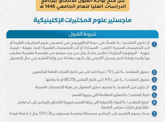 برعاية وكيل الجامعة للشؤون الأكاديمية أ.د محمد بن يحيى عريشي يدعوكم مركز علاقات الخريجين بعمادة شؤون الطلاب، بالتعاون مع الهيئة السعودية للتخصصات الصحية لحضور ورشة "دعم وتثقيف خريجي التخصصات الصحية" •الثلاثاء 21 مايو •الساعة 1:00 ظهراً • مسرح كلية