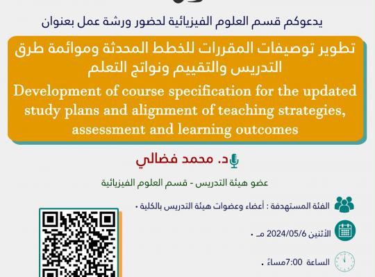 ورشة عمل بعنوان تطوير توصيفات المقررات للخطط المحدثة وموائمة طرق التدريس والتقييم ونواتج التعلم