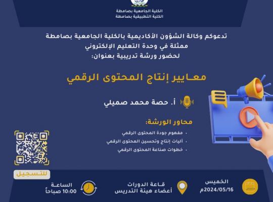 تتشرف الكلية الجامعية بصامطة سابقا والكلية التطبيقية بصامطة بدعوتكم لحضور ورشة تدريبية بعنوان"معايير إنتاج المحتوى الرقمي"
