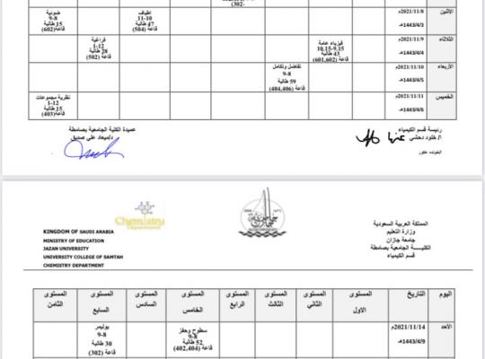 جدول الاختبارات الفصلية لقسم الكيمياء للفصل الأول 1443 - 2