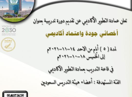 تعلن عمادة التطوير الاكاديمي عن تقديم دورة تدريبية بعنوان " أخصائي جودة واعتماد أكاديمي " لمدة 5 أيام من الاحد 14-11-2021م إلى الخميس 18-11-2021م يقدمها فريق عمادة التطوير الاكاديمي في قاعة التدريب بعمادة التطوير الاكاديمي . تستهدف الدورة أعضاء هيئة