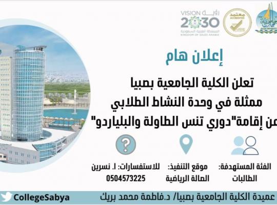 تعلن الكلية الجامعية بصبيا ممثلة في وحدة النشاط الطلابي عن إقامة "دوري تنس الطاولة والبلياردو" حيث يستهدف الطالبات في الصالة الرياضية بالكلية. لمزيد من الاستفسارات الرجاء التواصل مع أ. نسرين على هذا الرقم 0504573225