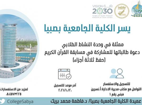يسر الكلية الجامعية بصبيا ممثلة في وحدة النشاط الطلابي دعوة طالباتها للمشاركة في مسابقة القرآن الكريم (حفظ ثلاثة أجزاء)، ضمن خطة انشطة الكلية. للتسجيل ولمزيد من المعلومات الرجاء التواصل مع مكتب مديرة الإدارة أ. نسرين (مبنى 1) حيث أن آخر موعد للتسجيل