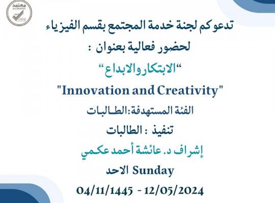 تدعوكم لجنة خدمة المجتمع بقسم الفيزياء لحضور فعالية بعنوان (الابتكار والابداع)