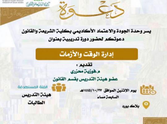 يسر وحدة الجودة والاعتماد الأكاديمي بكلية الشريعة والقانون دعوتكم لحضور دورة تدريبية بعنوان ( إدارة الوقت والأزمات ) تقديم م. فوزية محزري عضو هيئة تدريس بقسم القانون ..