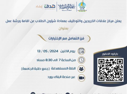 يعلن مركز علاقات الخريجين والتوظيف بعمادة شؤون الطلاب عن إقامة ورشة عمل بعنوان "فن التعامل مع الاختبارات” يوم الاثنين ٢٠٢٤/٠٥/١٣ من الساعة ٧ - ٨:٣٠ م عبر منصة Blackboard للحضور يرجى مسح الباركود الموضح بالإعلان