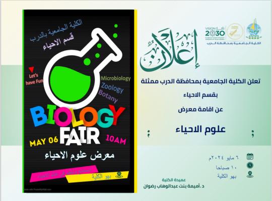 تعلن الكلية الجامعية بالدرب ممثلة بقسم الاحياء قيام معرض العلوم يوم الاثنين 6 مايو 2024في تمام الساعة العاشرة بهو الكلية