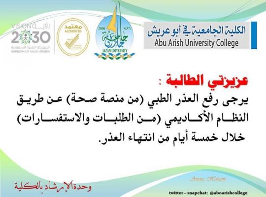 يعلن قسم الحاسب الآلي بالكلية الجامعية بصبيا أن اختبارات الأعذار البديلة النصف فصلية للفصل الثاني للعام الجامعي 1441 – 1442 هـ ستعقد حضورياً بمشيئة الله تعالى خلال الأسبوع الحادي عشر حسب الجدول المرفق. جدول الاختبارات البديلة
