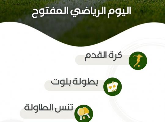 تدعوكم لجنة الثقافة والترفيه مشاركتها اليوم الرياضي - طلاب - الذي سيقام يوم الجمعة ٢٠ يناير متضمنا عدة فعاليات وأنشطة رياضية كـ كرة القدم، تنس الطاولة، البلوت، الفرفيرة، الضمنة، البلايستيشن والشطرنج.. نتطلع لمشاركتكم وحضوركم