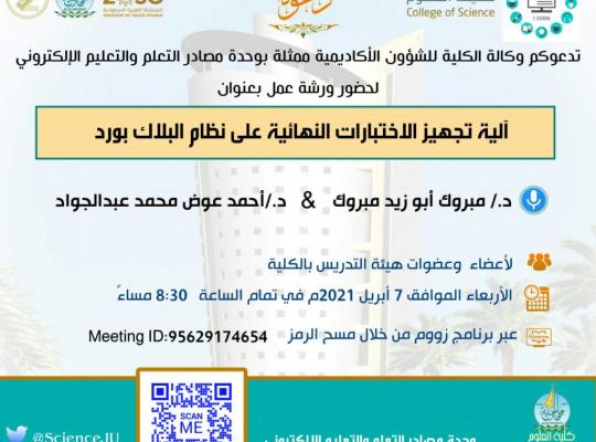 ورشة عمل بعنوان ” آلية تجهيز الاختبارات النهائية على البلاكبورد”
