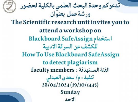 تدعوكم وحدة البحث العلمي بالكلية لحضور ورشة عمل بعنوان (استخدام BIackboard SafeAssign)للكشف عن السرقة الادبية