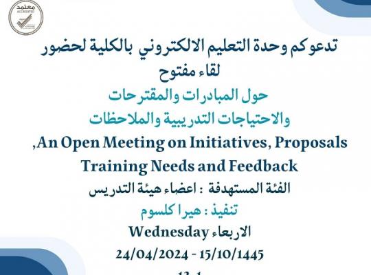 تدعوكم وحدة التعليم الالكتروني بالكلية لحضور لقاء مفتوح حول المبادرات والمقترحات والاحتياجات التدريبية والملاحظات