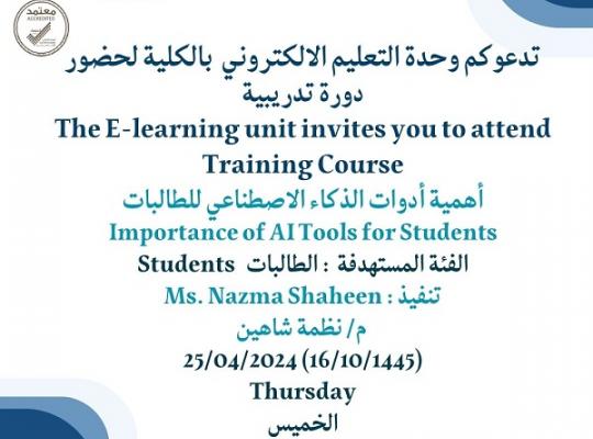 تدعوكم وحدة التعليم الالكتروني بالكلية لحضور دورة تدريبية عن أهمية أدوات الذكاء الاصطناعي للطالبات