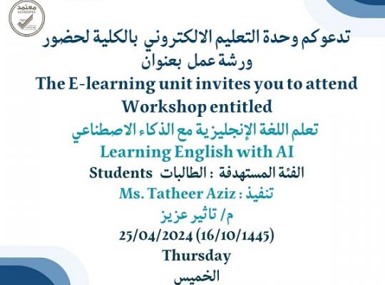 تدعوكم وحدة التعليم الالكتروني بالكلية لحضور ورشة عمل بعنوان (تعلم اللغة الإنجليزية مع الذكاء الاصطناعي)