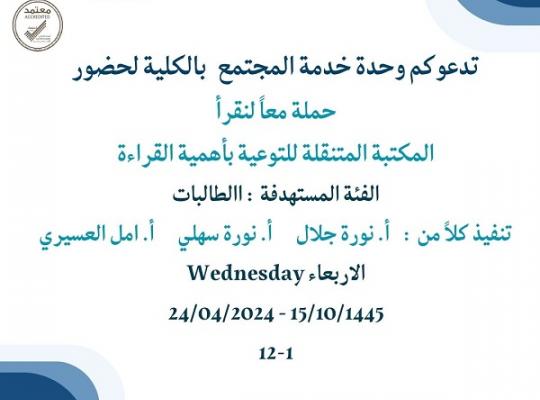 تدعوكم وحدة خدمة المجتمع بالكلية لحضور حملة معاً لنقرأ المكتبة المتنقلة للتوعية بأهمية الدراسة