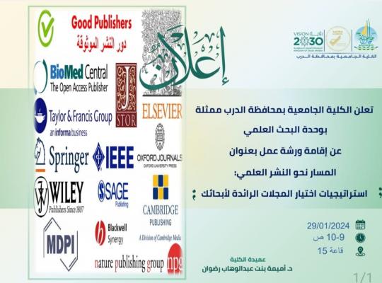 تعلن الكلية الجامعية بمحافظة الدرب عن اقامة ورشة عمل بعنوان المسار نحو البحث العلمي"استراتيجيات اختيار المجلات الرائدة للأبحاث"