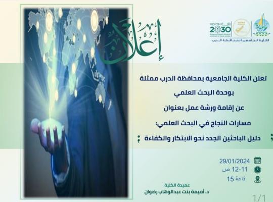تعلن الكلية الجامعة بمحافظة الدرب عن اقامة ورشة عمل بعنوان مسارات النجاح في البحث العلمي "دليل الباحثين الجدد نحو الابتكار والكفاءة"