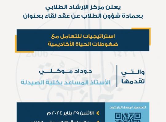 تدعوكم عمادة شؤون الطلاب ممثلة بمركز الإرشاد الطلابي للتسجيل وحضور اللقاء الإفتراضي الأول لطلاب وطالبات جامعة جازان بعنوان ( استراتيجيات للتعامل مع ضغوطات الحياة الأكاديمية ) ضمن سلسلة من اللقاءات الإرشادية نحو مسيرة أكاديمية متميزة للحضور يرجى مسح