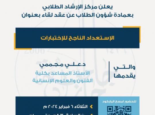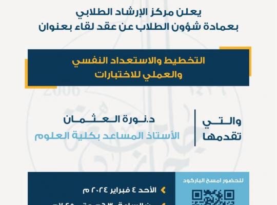تدعوكم عمادة شؤون الطلاب ممثلة بمركز الإرشاد الطلابي للتسجيل وحضور اللقاء الإفتراضي الثالث لطلاب وطالبات جامعة جازان بعنوان (التخطيط والاستعداد النفسي والعملي للاختبارات) ضمن سلسلة من اللقاءات الإرشادية نحو مسيرة أكاديمية متميزة للحضور يرجى مسح