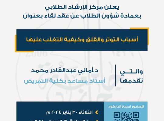 تدعوكم عمادة شؤون الطلاب ممثلة بمركز الإرشاد الطلابي للتسجيل وحضور اللقاء الإفتراضي الثاني لطلاب وطالبات جامعة جازان بعنوان ( أسباب التوتر والقلق وكيفية التغلب عليها ) ضمن سلسلة من اللقاءات الإرشادية نحو مسيرة أكاديمية متميزة.