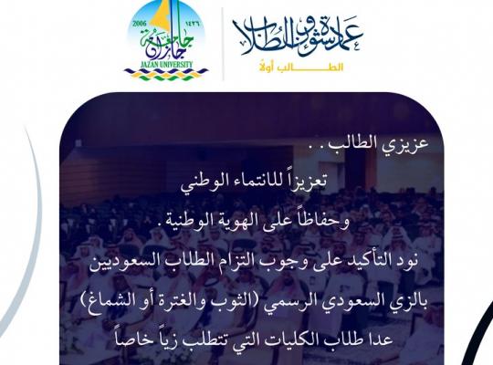 تعزيزاً للانتماء الوطني، وتأكيداً على أهمية المحافظة على الهوية #السعودية، تؤكد #جامعة_جازان على جميع طلبتها السعوديين بوجوب الالتزام بالزي السعودي الرسمي في جميع مرافق الجامعة حسب مانصت عليه التوجيهات الرسمية. #نشاطكم_يميزنا