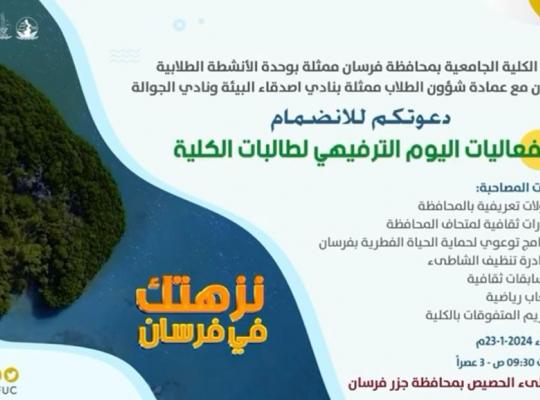 يسر الكلية الجامعية بفرسان ممثلة بوحدة الأنشطة الطلابية وبالتعاون مع عمادة شؤون الطلاب ممثلة بنادي أصدقاء البيئة ونادي الجوالة دعوتكم للانضمام لفعاليات اليوم الترفيهي يوم الثلاثاء الموافق 23/1/2024م من الساعة 9:30ص الى 3 عصرا بشاطئ حصيص