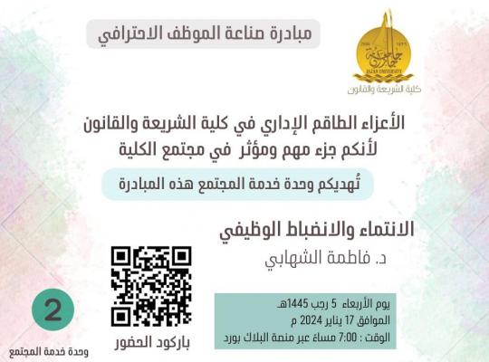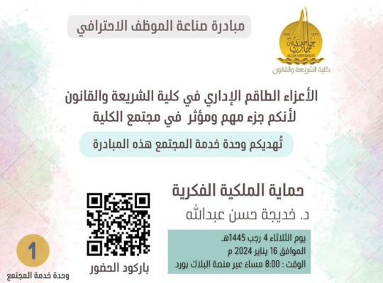 يسر وحدة خدمة المجتمع تقديم مبادرة صناعة الموظف الاحترافي ( حماية الملكية الفكرية ) يوم الثلاثاء الموافق ١٤٤٥/٠٧/٠٤هـ الثامنه مساءً عبر منصة البلاك بورد ..