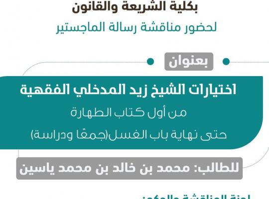 يدعوكم قسم الشريعة بكلية الشريعة والقانون لحضور مناقشة رسالة الماجستير بعنوان: اختيارات الشيخ زيد المدخلي الفقهية من أول كتاب الطهارة حتى نهاية باب الغسل ( جمعاً ودراسة )
