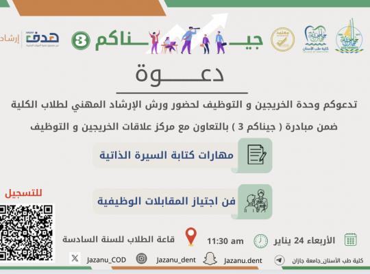تعلن وحدة الخريجين والتوظيف بـ #كلية_طب_الاسنان_بجامعة_جازان عن تنفيذ ورش الإرشاد المهني ضمن مبادرة"جيناكم ٣" من من @arcs_jazanu @stujazanu والتي تهدف لتقديم خدمات الإرشاد المهني لطلبة الكلية بالتعاون مع مركز علاقات الخريجين والتوظيف. وذلك يوم