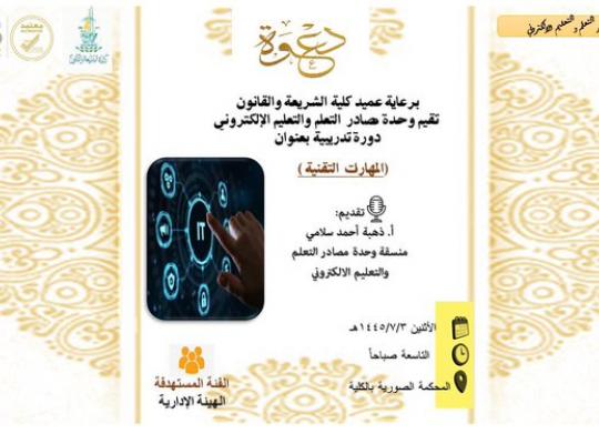 دعوة برعاية عميد كلية الشريعة والقانون تقيم وحدة مصادر التعلم والتعليم الإلكتروني دورة تدريبية بعنوان ( المهارات التقنية ) تقديم : أ. ذهبة سلامي منسقة وحدة مصادر التعلم والتعليم الالكتروني..