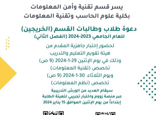 يسر قسم تقنية وأمن المعلومات بكلية علوم الحاسب وتقنية المعلومات دعوة الطلاب والطالبات الخريجين للعام الجامعي 2023-2024، الفصل الدراسي الثاني، لحضور اختبار "جاهزية" الذي تقدمه هيئة تقويم التعليم والتدريب. سيتم الاختبار في يوم الإثنين 29-1-2024 الساعة