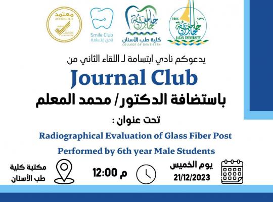 يدعوكم نادي كلية طب الأسنان الاسنان وبالتعاون مع وحدة خدمة المجتمع والأنشطة الطلابية لحضور اللقاء الثاني من "Journal Club "ضمن سلسلة برامج Postgrad-skill it باستضافة الدكتور / محمد المعلم وذلك في يوم الخميس 21/12/2023 في تمام الساعه 12 م بمكتبة