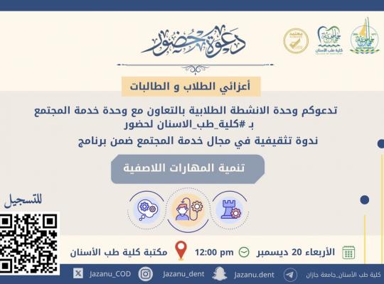 تدعوكم وحدة الأنشطة الطلابية بالتعاون مع وحدة خدمة المجتمع بـ #كلية_طب_الاسنان لحضور ندوة تثقيفية في مجال خدمة المجتمع ضمن برنامج تنمية المهارات اللاصفية. وذلك يوم الاربعاء ٢٠/ ١٢ /٢٠٢٣ في تمام الساعة ١٢ م بمكتبة الكلية ملاحظة : المحاضرة للطلاب