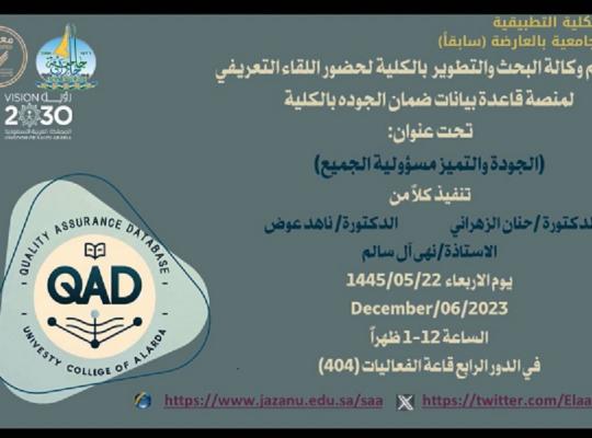تدعوكم وكاله البحث والتطوير بالكلية لحضور اللقاء التعريفي لمنصة قاعدة بيانات ضمان الجوده بالكلية