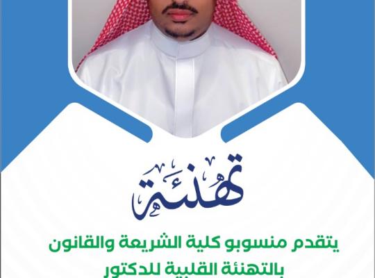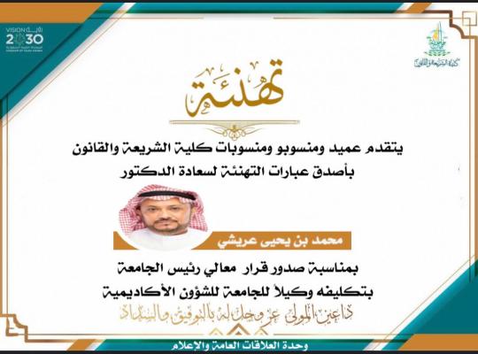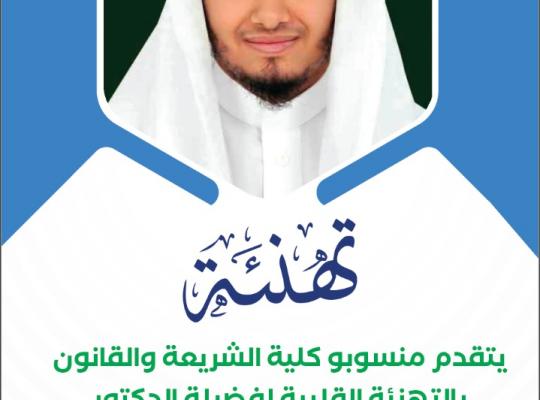 يتقدم عميد ومنسوبي كلية الشريعة والقانون بأصدق عبارات التهنئة لفضيلة الدكتور صقر بن أحمد طوهري