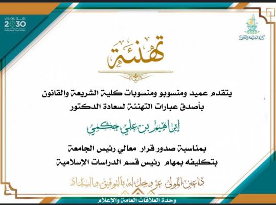 يتقدم عميد ومنسوبي كلية الشريعة والقانون جازان بأصدق عبارات التهنئة لفضيلة الدكتور حسين بن ناصر آل إبراهيم .
