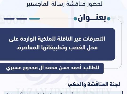 يدعوكم قسم الشريعة #كلية_الشريعة_والقانون_جازان لحضور مناقشة رسالة الماجستير بعنوان “ التصرفات غير الناقلة للملكية الواردة على محل الغصب وتطبيقاتها المعاصرة " للطالب : أحمد حسن محمد آل مجدوع عسيري ..
