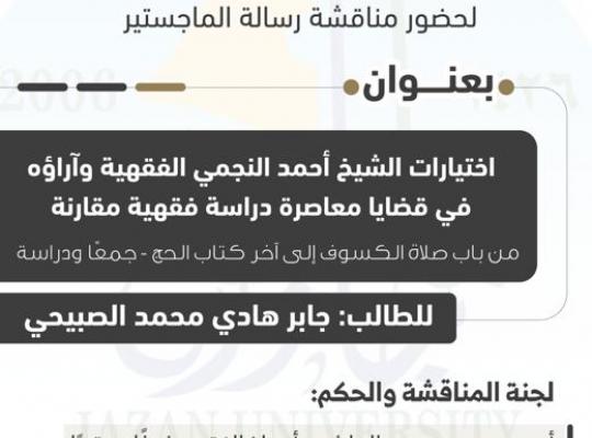 يدعوكم قسم الشريعة #كلية_الشريعة_والقانون_جازان لحضور مناقشة رسالة الماجستير بعنوان “ اختيارات الشيخ النجمي الفقهيه وآراؤه في قضايا معاصرة دراسة فقهية مقارنة " للطالب : جابر هادي محمد الصبيحي ..