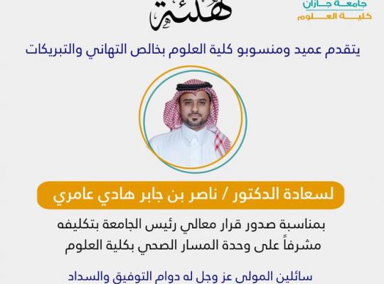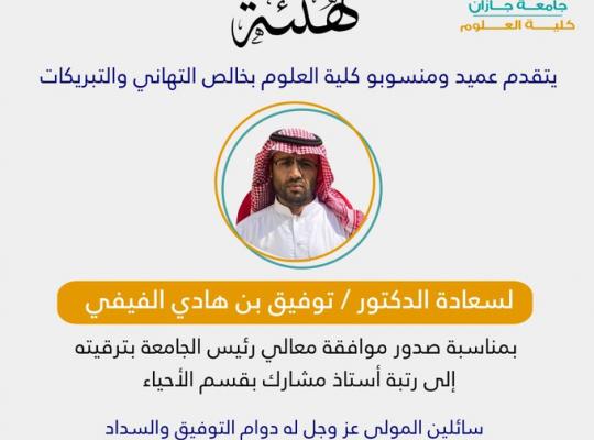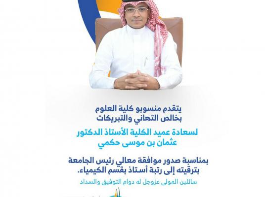تهنئة ... للدكتور عثمان حكمي بمناسبة ترقيته إلى رتبة استاذ بقسم الكيمياء