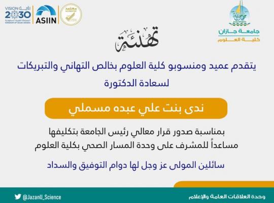 الدكتورة ندى مسملي مساعدة للمشرف على وحدة المسار الصحي بكلية العلوم