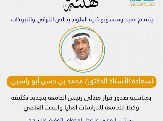 تهنئة للأستاذ الدكتور محمد أبوراسين بمناسبة صدور قرار معالي رئيس الجامعة بتجديد تكليفه وكيلا للجامعة للدراسات العليا والبحث العلمي