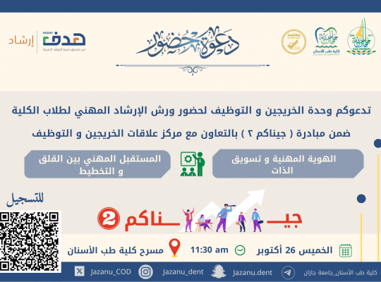 تعلن وحدة الخريجين والتوظيف بـ #كلية_طب_الاسنان_بجامعة_جازان عن إقامة ورش الإرشاد المهني ضمن مبادرة"جيناكم ٢" من @arcs_jazanu @stujazanu والتي تهدف لتقديم خدمات الإرشاد المهني لطلبة الكلية بالتعاون مع مركز علاقات الخريجين والتوظيف