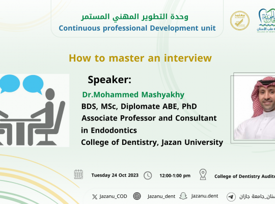 تعلن كلية طب الأسنان ممثلة في وحدة التطوير المهني المستمر عن إقامة محاضرة بعنوان “How to master an interview " يقدمها الدكتور محمد مشيخي ذلك يوم الثلاثاء ٢٤ /١٠ /٢٠٢٣ في تمام الساعة ١٢ م بمسرح الكلية ..