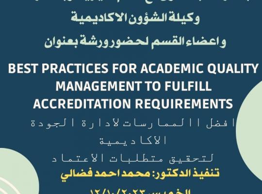 ورشة بعنوان (افضل الممارسات لإدارة الجودة الأكاديمية لتحقيق متطلبات الاعتماد)