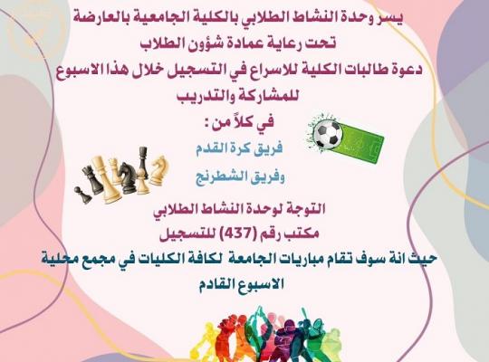يسر وحدة النشاط الطلابي بالكلية الجامعية بالعارضة دعوة الطالبات الاسراع في التسجيل خلال هذا الاسبوع
