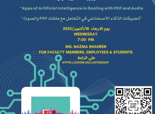 تدعوكم وحدة التعليم الالكتروني بالكلية لحضور ورشة عمل بعنوان تطبيقات الذكاء الاصطناعي في التعامل مع ملفات PDF والصوت
