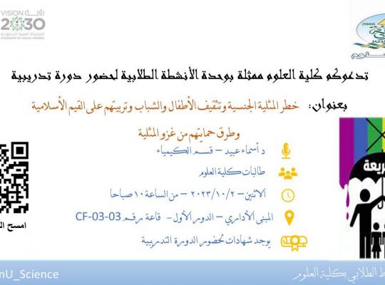دورة تدريبية بعنوان" خطر المثلية الجنسية وتثقيف الأطفال والشباب وتربيتهم على القيم الإسلامية وطرق حمايتهم من غزو المثلية الجنسية" بشطر الطالبات بكلية العلوم