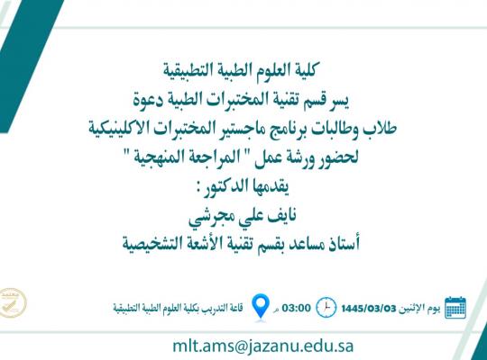يسر قسم تقنية المختبرات الطبية ان تدعوا طلاب وطالبات برنامج ماجستير المختبرات الاكلينيكية لحضور محاضرة Systematic review: A beginner's guide يقدمها الدكتور نايف مجرشي يوم الاثنين - الساعة ٣:٠٠ - ٣/٣/١٤٤٥ الموافق ١٨/٩/٢٠٢٣ المكان قاعة التدريب بكلية